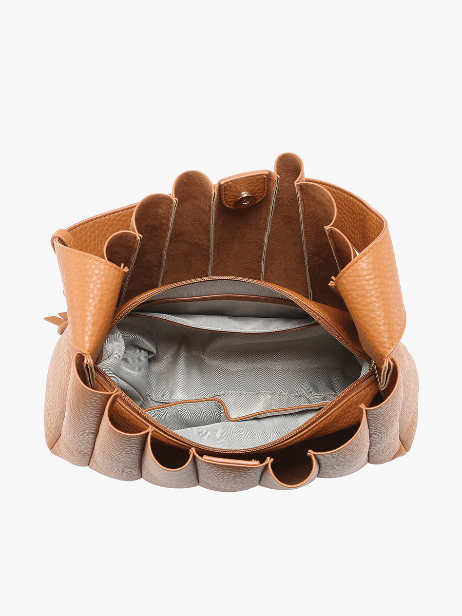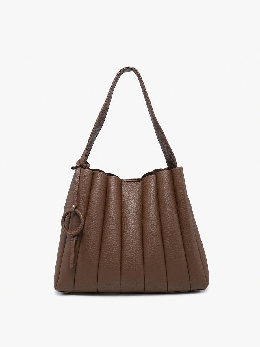 The Josie Pleated Satchel with Ring Tassel is a stylish and functional tote bag that features elegant pleating and a chic ring tassel charm. Designed with a magnetic snap closure and an inner bag with an adjustable. removable crossbody strap. this satchel offers both sophistication and versatility.