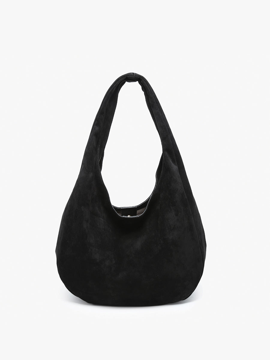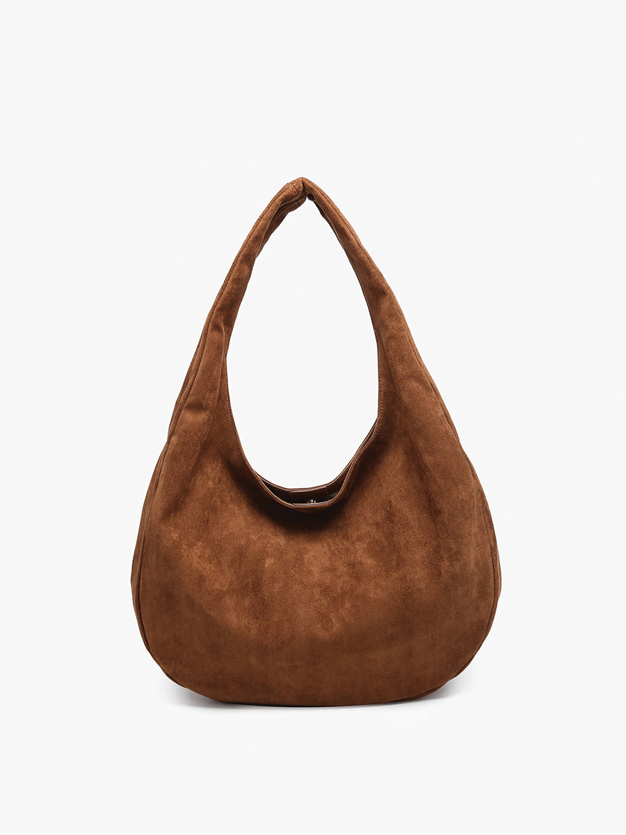 The Katherine Slouchy Round Hobo combines elegance with functionality in a versatile design. Made from soft faux suede. this hobo bag features a slouchy silhouette and magnetic snap closures for easy access. The spacious interior includes an inner zip pocket and two slip pockets. offering ample storage for your essentials.