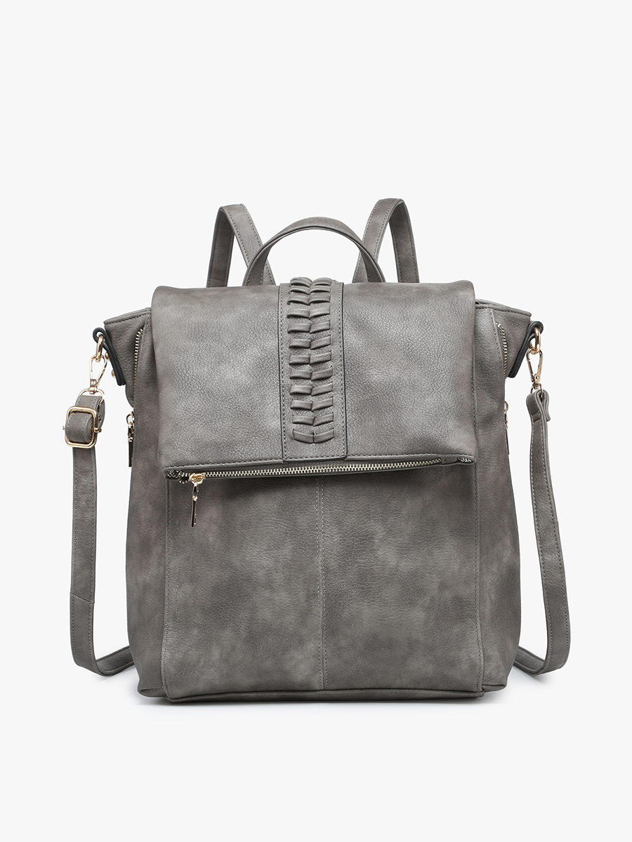 - Distressed color and whipstitch detail for a vintage-inspired look.